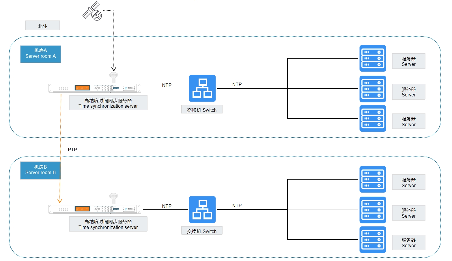 “PTP网络授时拉远方案”所示,在本方案中,二级机房不链接卫星,而使用一级机房链接至二级机房的专线(必须使用专线,不然同步精度影响较大),与一级机房的主时钟进行PTP同步(高精度网络同步),一二级机房主时钟同步精度可达到500us以内,远小于NTP同步精度10ms(10000us),可保证多机房之间NTP时间同步。